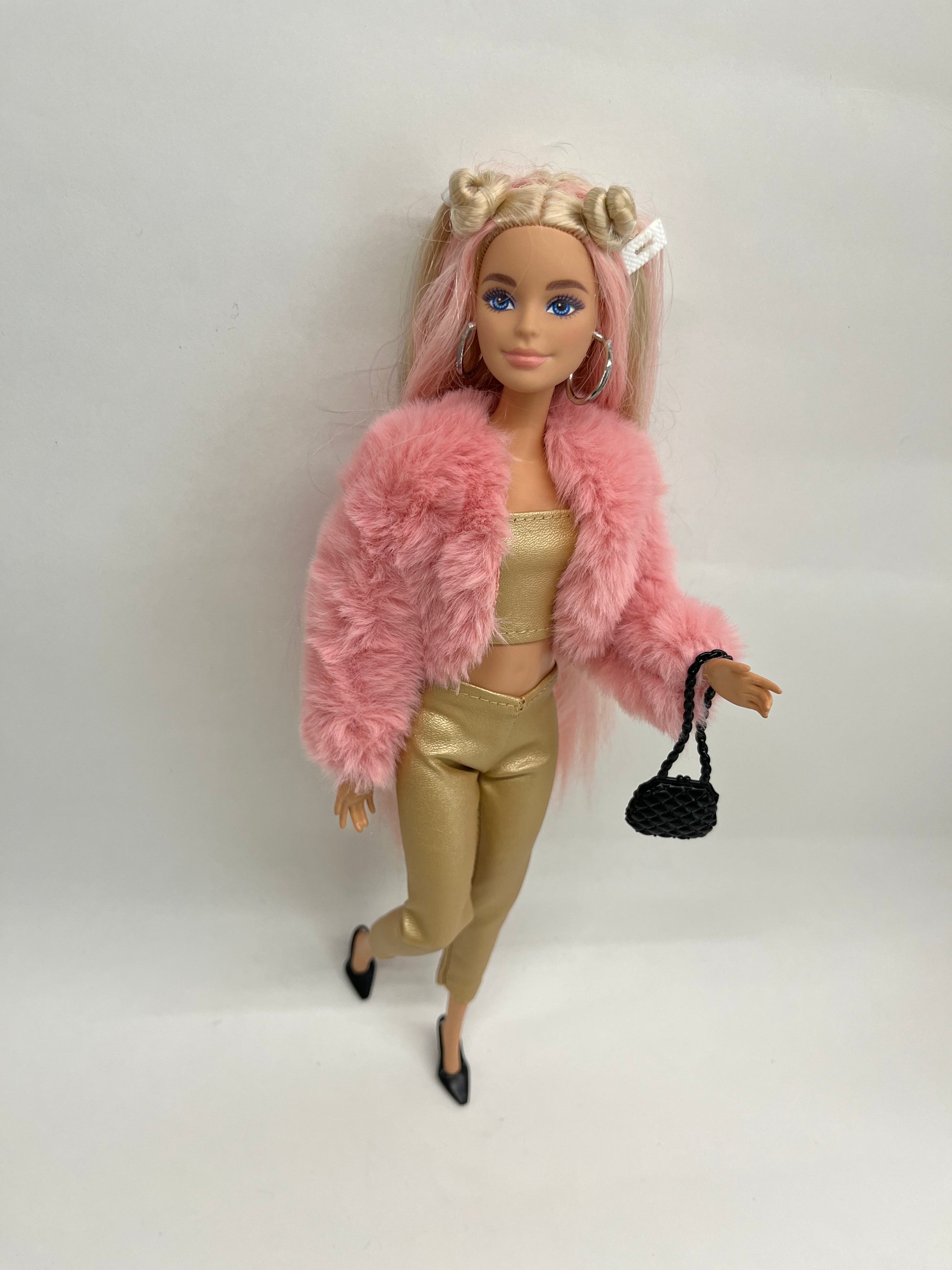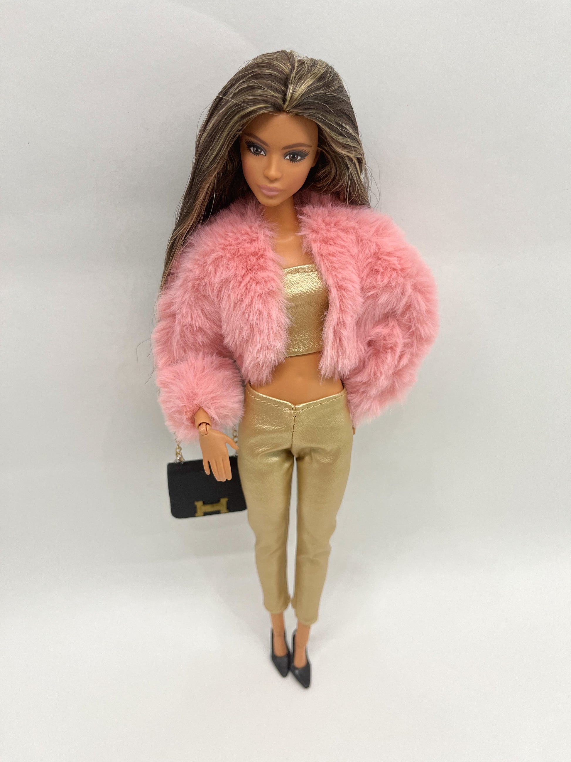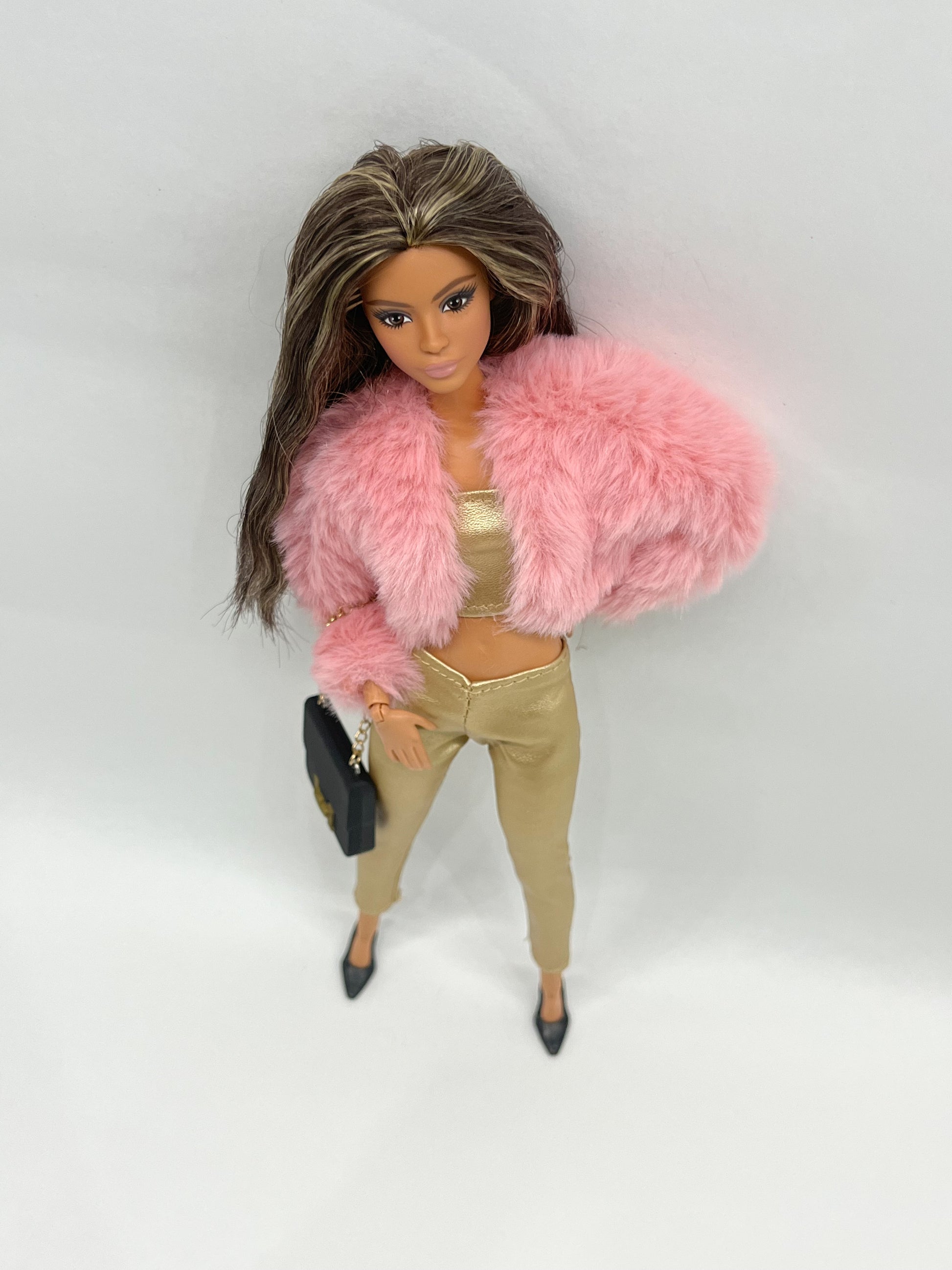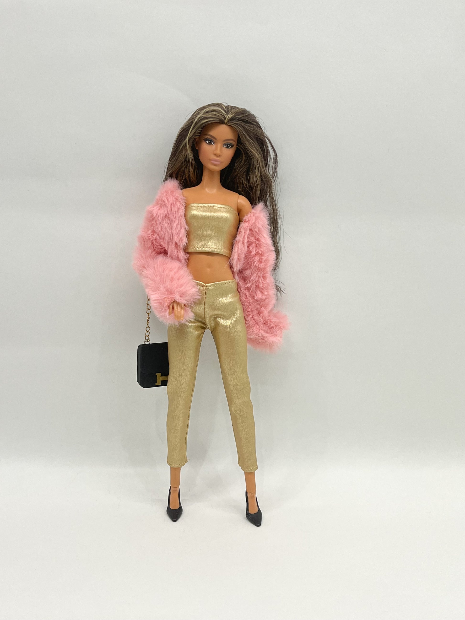 Комплект дрехи за кукла Барби, включващ златен топ, панталон и пухкаво розово късо палтенце