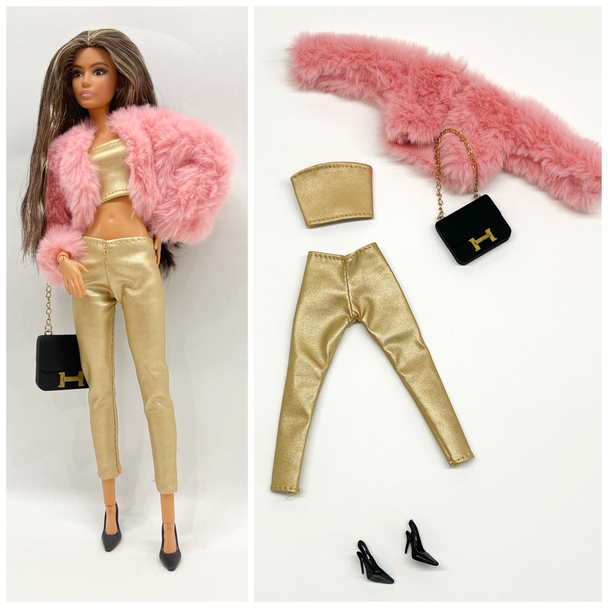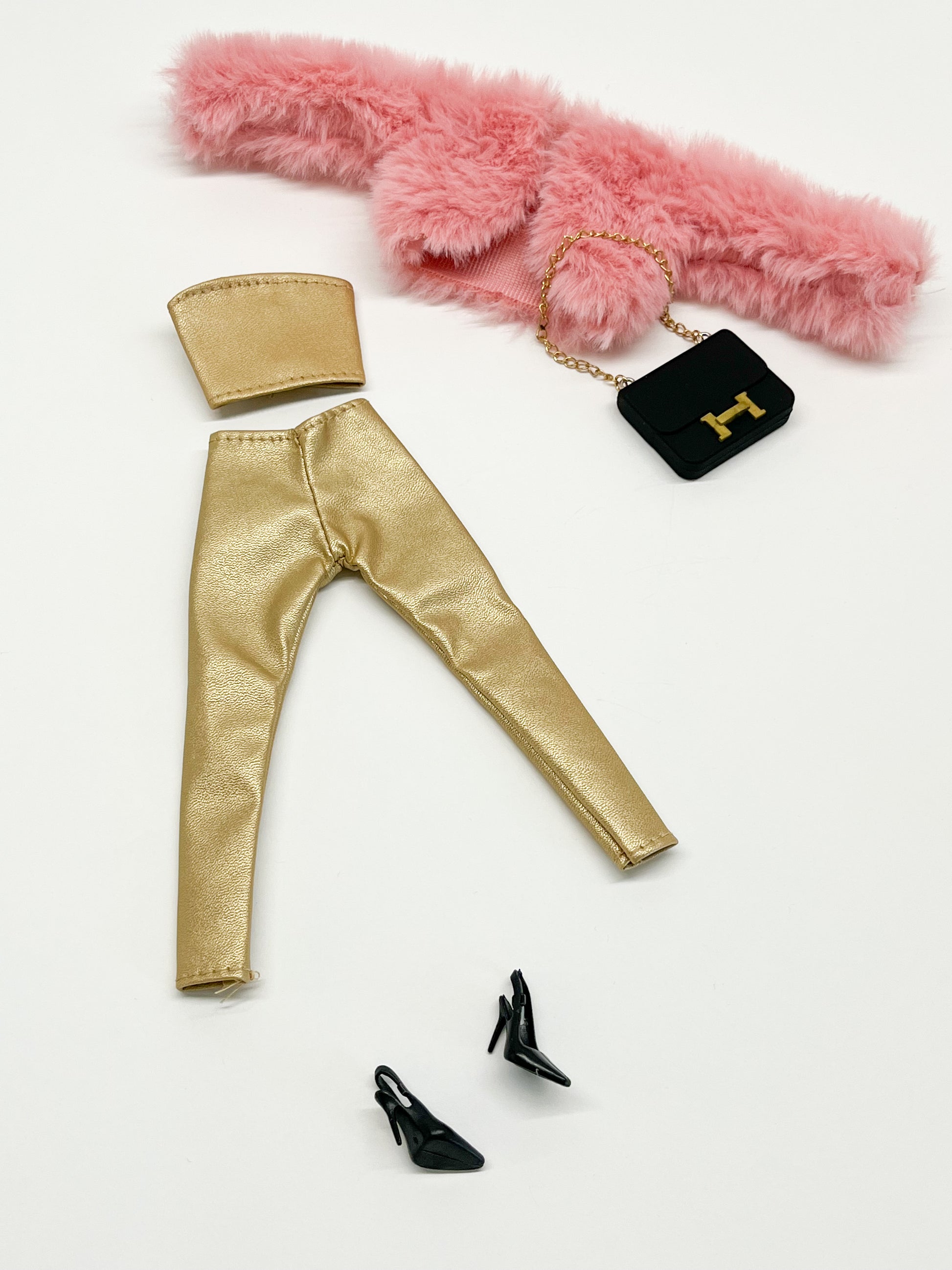 Супер смел и модерен сет, вккючващ златен топ и панталон, пухкаво розово якенце, черни високи обувки и луксозна чантичка.