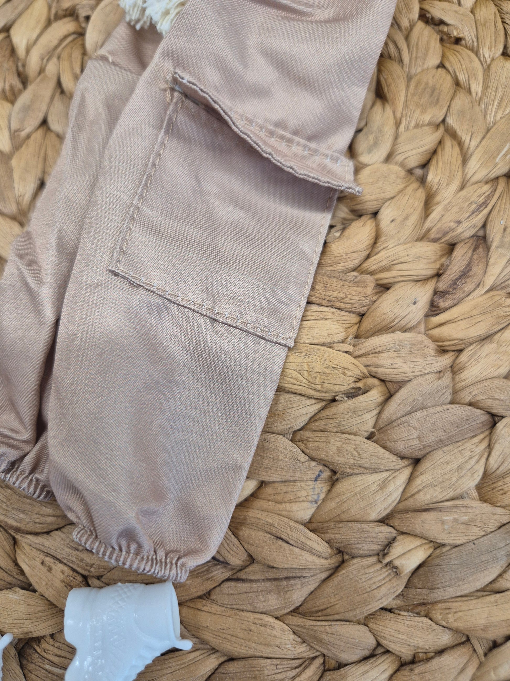 - Бежови панталони тип карго с джобове и ластици в долната част.